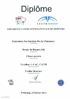 Offene Klasse Hündinnen 1 V CAC-CACIB-BOB Duchesse de Vaudagne Herr G. Cottet Championne Suisse 2 V RCAC-RCACIB Diva-Duchesse vom Holligenwald Herr E. Meinen 3 V Cléor de la Noe du Jardin Frau M. Moreau-Ponce 4 V Esperanza du Gardien de la Puissance Frau E. Brunner V Déesse des Blés Dorés Herr D. Delétroz SG Eila de la Noe du Jardin Frau B. Nyffeler