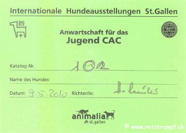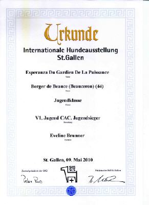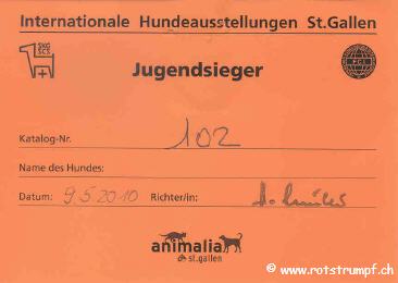 Am Sonntag 9.Mai 2010 waren wir an der Ausstellung in St. Gallen. Das war toll! Ich habe ein V1, CAC und den Jugendsieger erhalten. Ich durfte dann sogar für das BOB (Best of Bread) antreten, hatte aber gegen die anderen zwei keine Chance so als Junghund. Am Schluss bin ich mit allen Jugendsieger der anderen Rassen im Ehrenring gelaufen. Der Richter war Herr H.W. Müller.