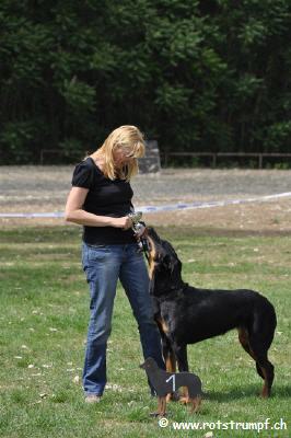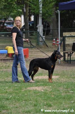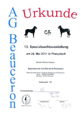 Na, das war ein Wochenende!! Eigentlich wollte mich Eveline gar nicht anmelden. Sie dachte, ich sei noch zu jung um mit dieser Konkurrenz anzutreten und dann die weite Fahrt. Na denkste! Wir sind am Freitagabend nach 5 1/2 Stunden Fahrt endlich in Pfungstadt angekommen. Kaputt und genervt durch das lange Stehen im Stau.... Aber was soll ich sagen, es hat sich gelohnt! Am Vormittag konnten wir noch gemütlich die Sonne geniessen und die vielen schönen Hunde bestaunen. Djamal Poussière de Lune war auch dabei und hat in der Jugendklasse das V3 gewonnen. Herzliche Gratulation! Henry (Cold Wind of Walhalla's Degas - mein neuer Freund) hat die Championsklasse gewonnen. Auch ihm Herzliche Gratulation! Am Nachmittag kamen dann wir an die Reihe. Es dauerte sehr lange bis wir endlich in den Ring durften, zwei Runden rennen (ziemlich eng bei so vielen Hunden) um dann gleich wieder rauszugehen, da unsere grosse Klasse in 4 Gruppen aufgeteilt wurde. Ich wusste ja, dass ich nochmals in den Ring sollte, aber ich war doch langsam etwas müde und erschöpft von den vielen Eindrücken... Tja und dann ging irgendwie alles sehr schnell :-) Ich habe mich vorzüglich präsentiert (wer bin ich denn?!) und so kam's, dass ich am Schluss hinter dem Schildchen 1 stand. Toll! Eveline konnte es noch gar nicht begreifen, dafür hat unser Fanclub aussen am Ring um so lauter gejubelt! :-O Vielen Dank an alle, die uns unterstützt und die Daumen gedrückt haben. Übrigens 2te wurde Creole du Perouet (sie kommt aus der gleichen Zucht wie mein Vater). Toller Erfolg für die Zucht du Perouet!