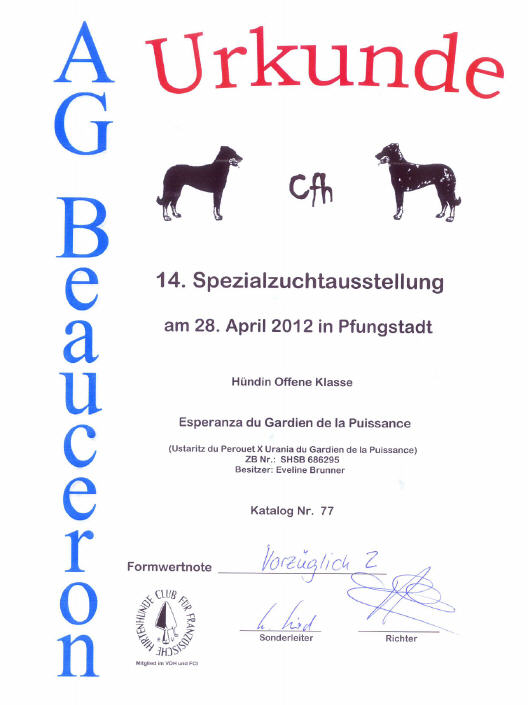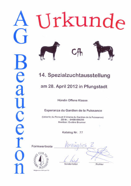 Wir waren auch dieses Jahr wieder in Pfungstadt. Zusammen mit Nicole, Arco und F'Topaz sind wir am Freitagabend in Pfungstadt angekommen. Und haben bereits da "alte" wie neue Bekannte angetroffen. Am Samstag war's dann so richtig heiss. Zum Glück konnten wir uns mit den Hunden in den Schatten verziehen, während der Richter und seine Helfer den ganzen Tag an der prallen Sonne verbrachten. Mit einem super Resultat und einem weiteren Pokal (das hat in der Schweiz seltenheitswert) sind wir am Abend glücklich und müde nach Hause gefahren.
